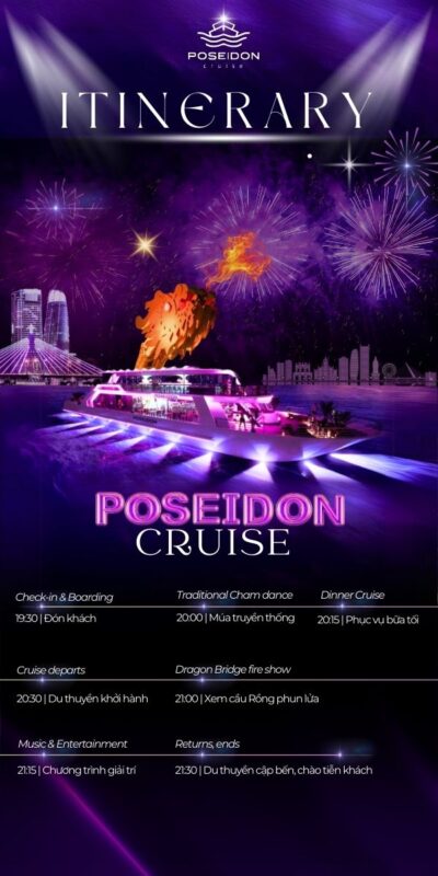 ♦ Du thuyền POSEIDON ĐÀ NẴNG là du thuyền đẳng cấp 3 sao, hiện đại, sang trọng nhất trên sông Hàn hiện nay. Hàng đêm sẽ có chuyến lúc 20h – 21h30.